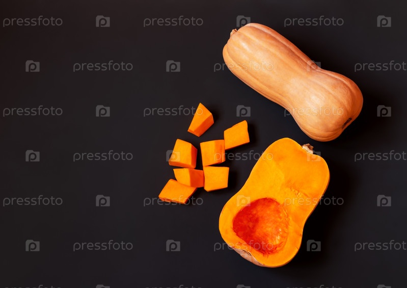 Баттернатная тыква и кусочки тыквы на темном фоне