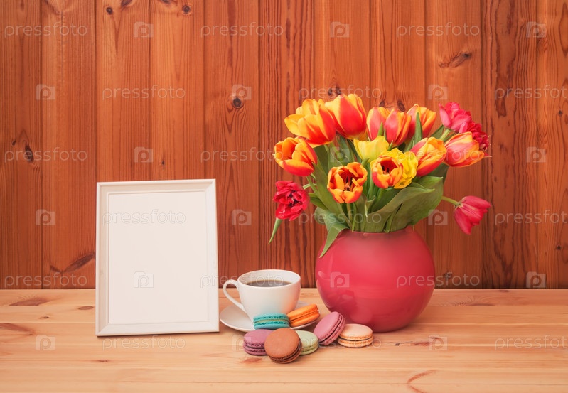Красочные тюльпаны, чашка кофе и белая рамка на деревянном столе