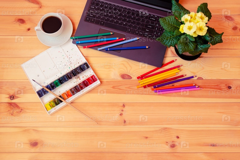 Цветные карандаши, акварельные краски, цветок первоцвета, чашка кофе и ноутбук на столе