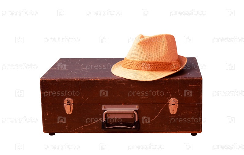 Старинный деревянный чемодан и шляпа. Изолированные на белом фоне