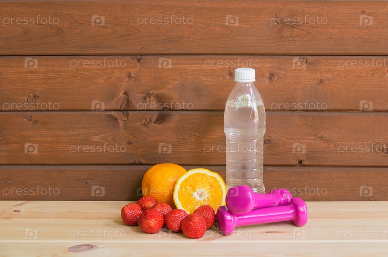 Гантели, бутылка воды, свежие апельсины и клубника. Концепция фитнеса и здорового питания