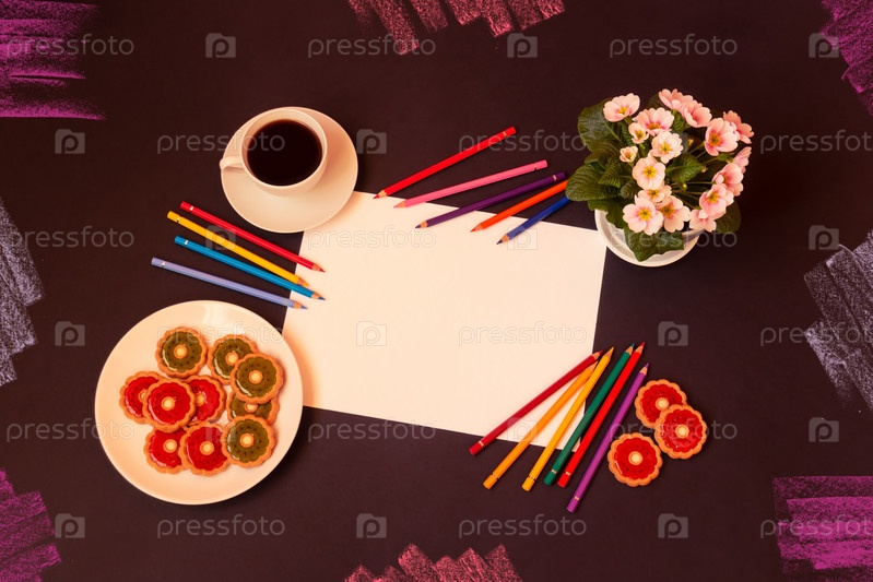 Лист чистой бумаги, цветные карандаши, чашка кофе, сладкое печенье с клубничным желе и желе из киви и цветок примулы на темном фоне