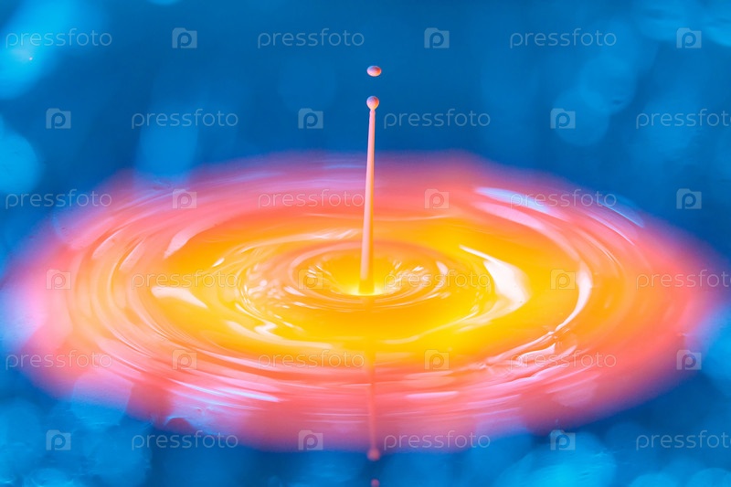 Капля попадает в густую жидкость с сине-желтым фоном. Абстрактный красочный фон
