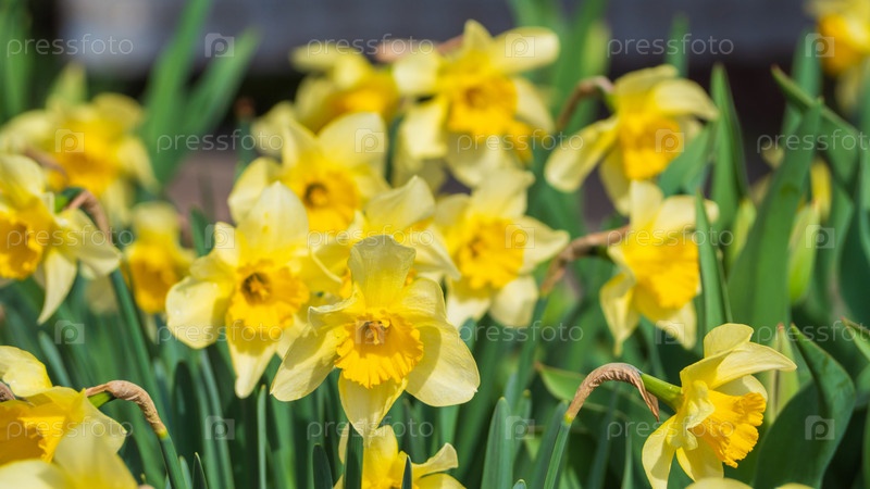 Группа желтых цветущих нарциссов в саду весной