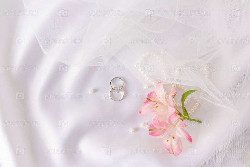 Макет для открыток, приглашений, обложек. Вид сверху на два платиновых обручальных кольца с бриллиантами на белом атласном фоне с весенними цветами