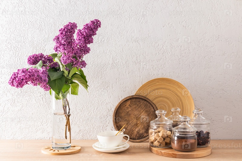 Красивый кухонный фон со стеклянными банками для хранения чая, кофе, сахара и чашки на фоне серой текстурированной стены. Ваза с цветами