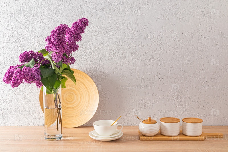 Керамические банки для хранения и сахарница на кухонной деревянной столешнице, чашка чая и стеклянная ваза с букетом сирени. минимализм