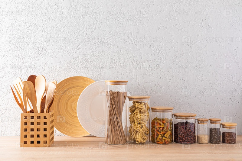 Кухонный фон современной кухни. банки с сыпучими продуктами и деревянный ящик с деревянными ложками. Минималистский стиль. Эко посуда