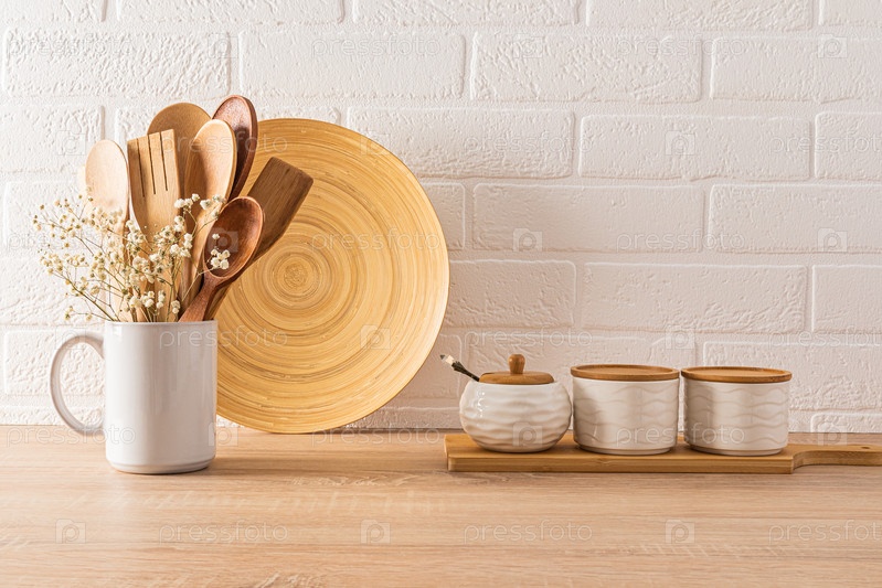 Керамические банки с бамбуковой крышкой и сахарницей, кружка с деревянными ложками на деревянной столешнице в интерьере современной экологически чистой кухни