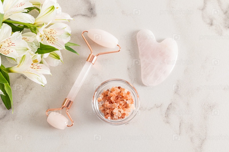 Кварцевый массажный ролик и скребок гуаша на фоне белого мрамора с цветами астромерии и миской морской соли. Вид сверху. Копия пространства