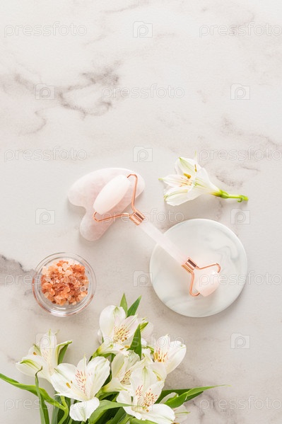Набор косметики для ухода за увядающей кожей. Массажер из розового кварца и гуаша для лифтинга и коррекции фигуры. Вертикальный вид. Копия пространства