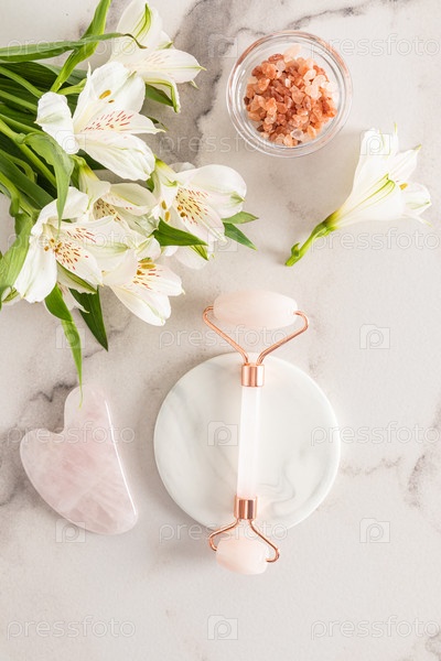 Роликовый массажер из натурального камня, гуаша и морской соли в чаше для ухода за кожей лица, декольте и шеи. Вертикальный вид