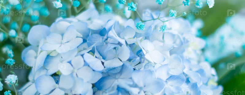 Красивый цветочный фон из нежной голубой гортензии и зеленых листьев веб-баннера