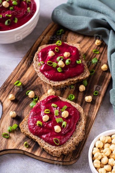 Аппетитные брускетты из ржаного хлеба со свекольным хумусом и луком на разделочной доске, вид сверху