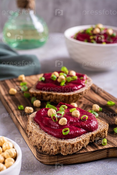 Домашние бутерброды из ржаного хлеба со свекольным хумусом и зеленью на разделочной доске, вертикальный вид