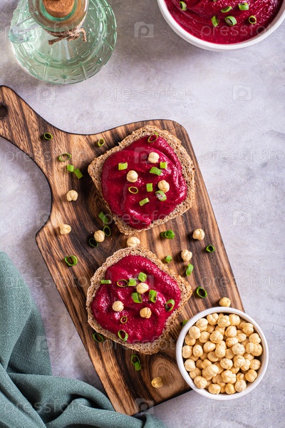 Брускетты из ржаного хлеба со свекольным хумусом и луком на разделочной доске сверху и вертикальный вид