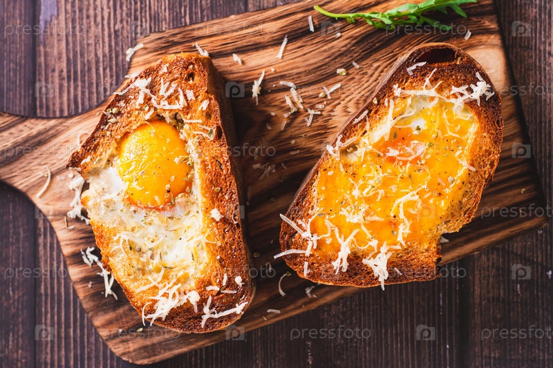 Крупный план хлеба, испеченного с яйцом и сыром на разделочной доске, вид сверху