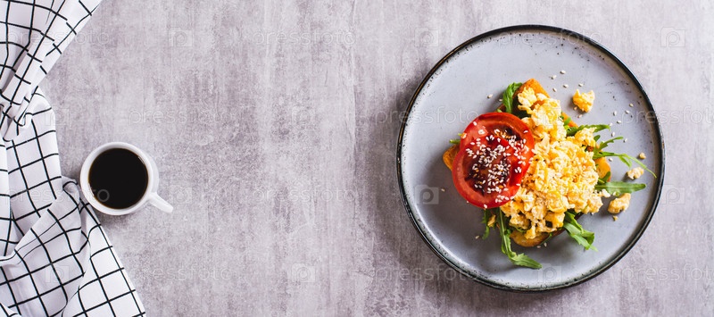 Брускетта с яичницей, рукколой, помидорами и кунжутом на тарелке, вид сверху, веб-баннер