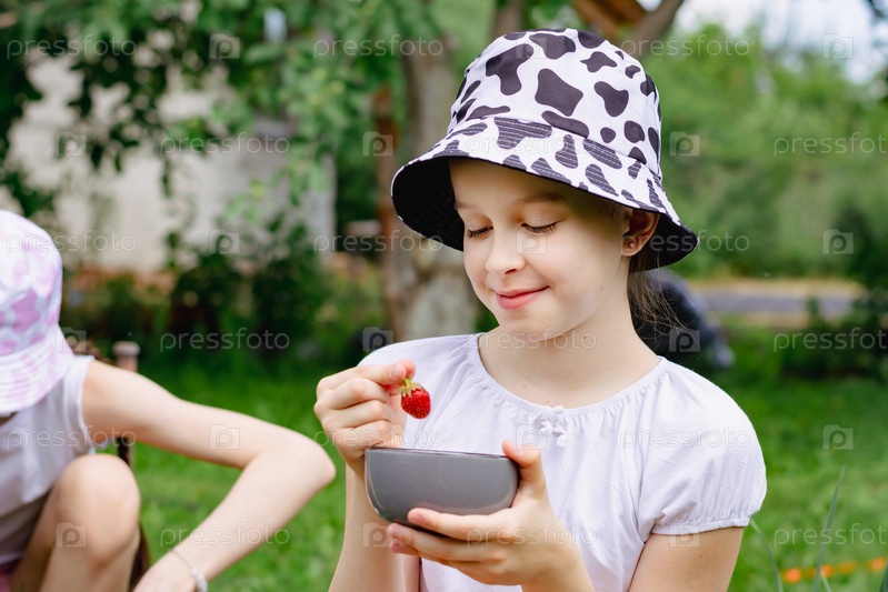 Девушка смотрит на собранную клубнику в миску и вручает в саду