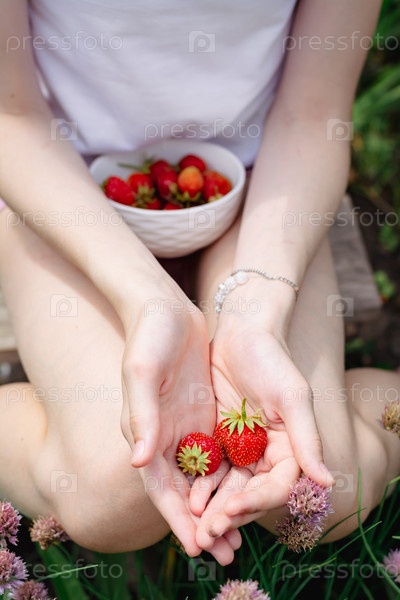 Девочка-подросток с миской клубники в руках сидит на кровати в вертикальном виде в саду