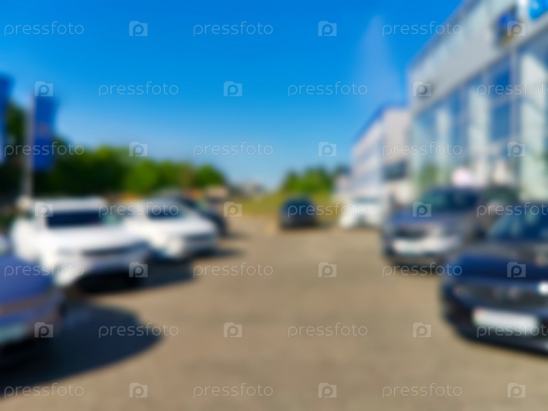 Аннотация размыта за пределами автосалона. Автомобили для тест-драйва стоят на стоянке