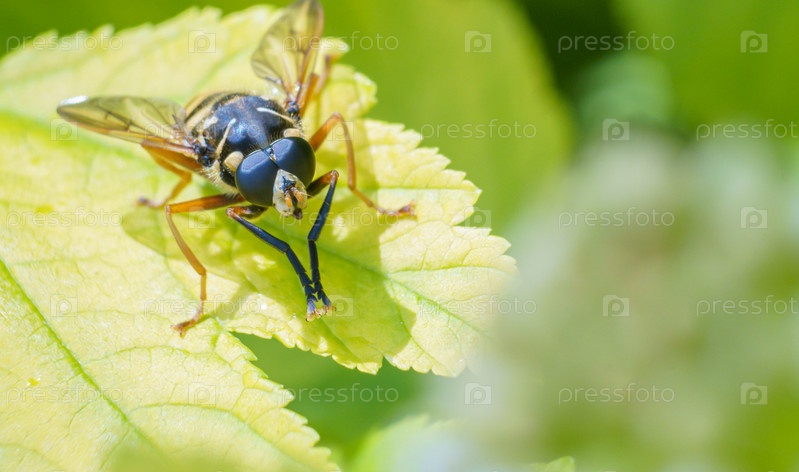 Журчалка на зеленом листе кустарника в саду. Крупный план насекомого
