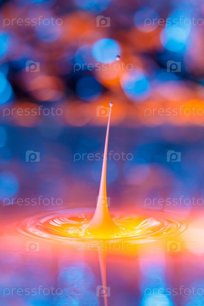 Капля попадает в густую жидкость с сине-желтым фоном. Абстрактный красочный фон