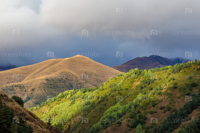 Высокогорья Северной Осетии. Горы Кавказа. Высокие горы в лучах заходящего солнца