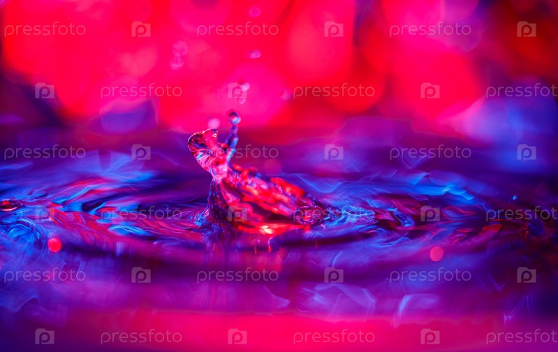 В воду падает прозрачная капля с красно-фиолетовым фоном. Абстрактный красочный фон