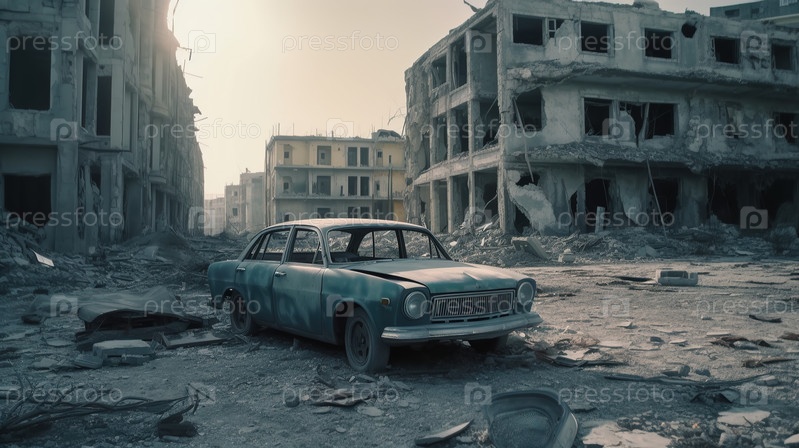 Разбитая машина на фоне разрушенного войной города. Генеративный ИИ