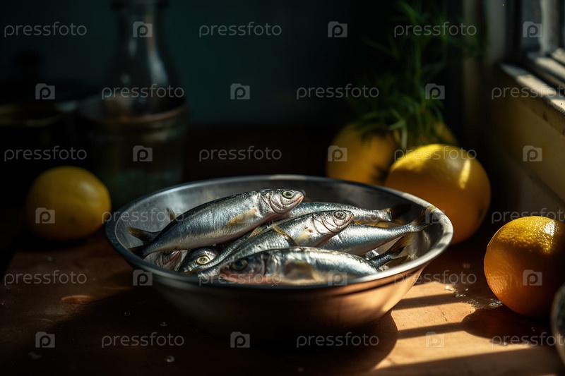 Свежие сардины в миске и лимон на кухонном столе. Свет из окна. Генеративный искусственный интеллект