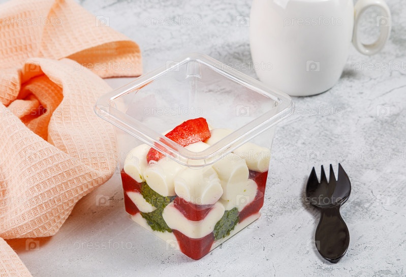 Десерт из сливок, шпината, джема и клубники в пластиковом стакане на бетонном фоне