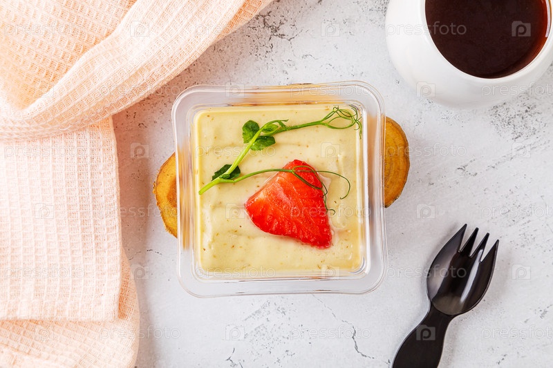 Сладкий десерт из крем-мюсли, варенья и клубники на бетонном фоне. Фото высокого качества