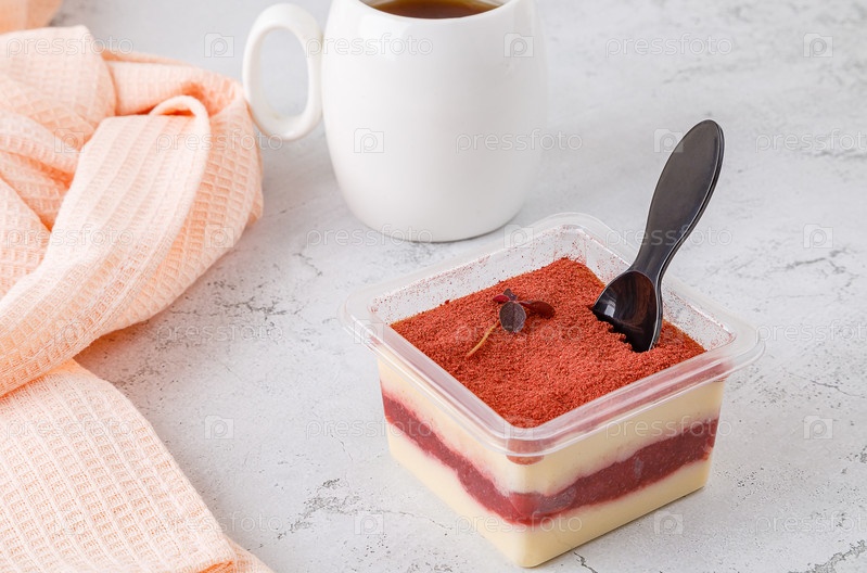 Десерт тирамису в пластиковой коробке с вилкой на бетонном фоне. Фото высокого качества