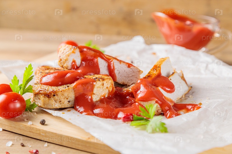 Кусочки жареной свинины с помидорами и кетчупом на деревянной доске