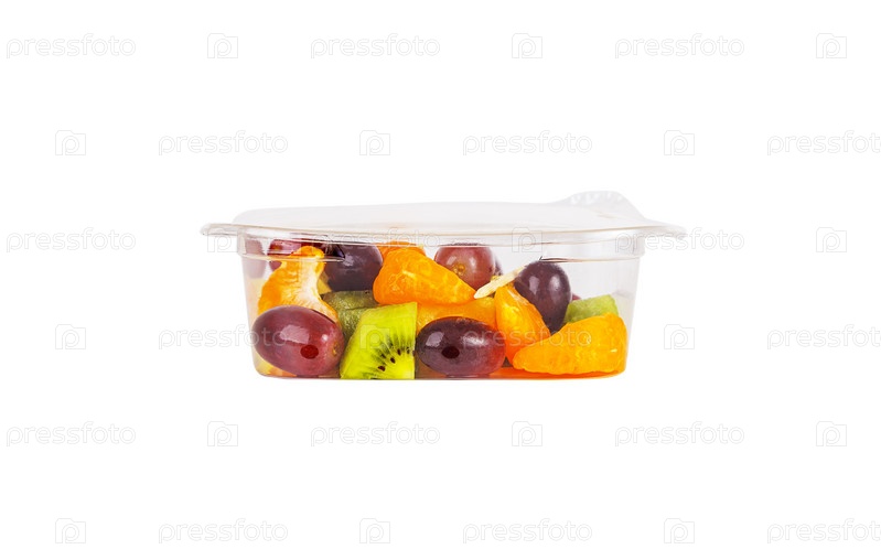 Фруктовый салат из ананаса, апельсина, киви и винограда в пластиковом контейнере на белом фоне. Фото высокого качества