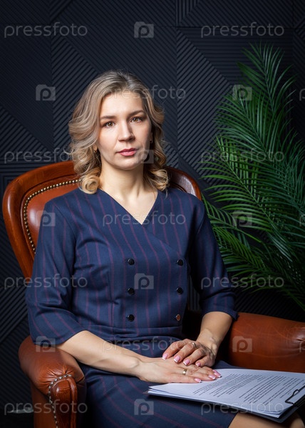 Портрет успешной женщины-психолога в ее кабинете, с блокнотом в руке, в кресле