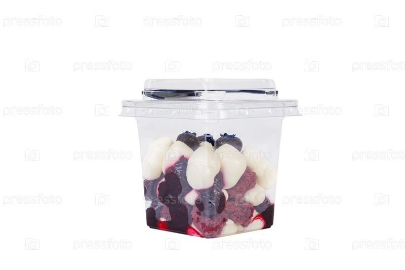 Десерт из сливок, варенья и черники в пластиковом стакане на белом фоне