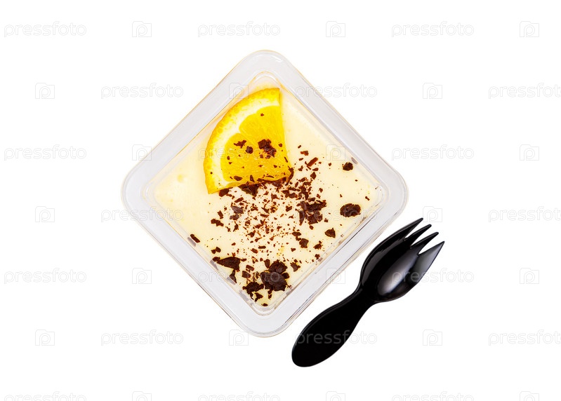 Десерт из белого и коричневого крема с долькой апельсина в пластиковом контейнере на белом фоне