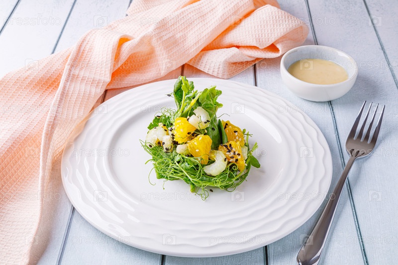 Салат с микрозеленью гороха, шпината, сельдерея, апельсина, семян кунжута и заправкой в тарелке на белом деревянном фоне