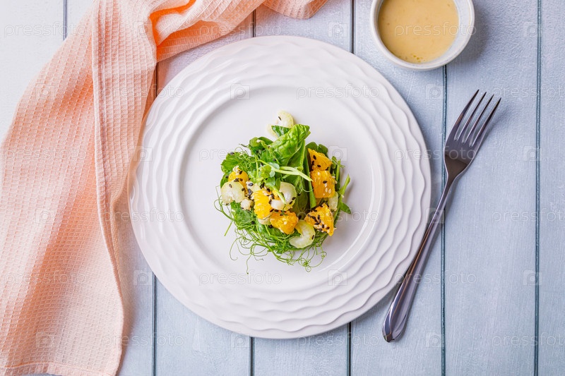 Салат с микрозеленью гороха, шпината, сельдерея, апельсина, семян кунжута и заправкой в тарелке на белом деревянном фоне