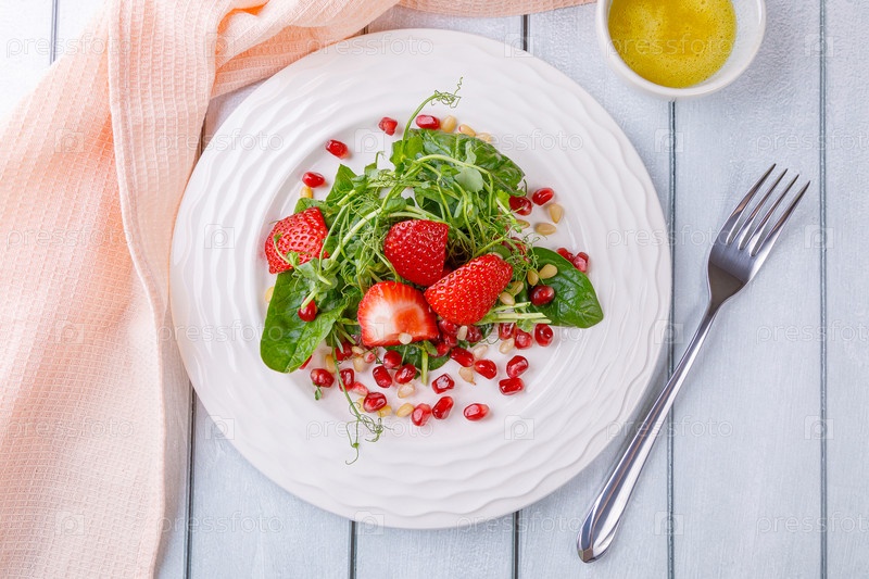Салат с микрозеленью, клубникой, кедровыми орешками и зернами граната. На белом деревянном фоне