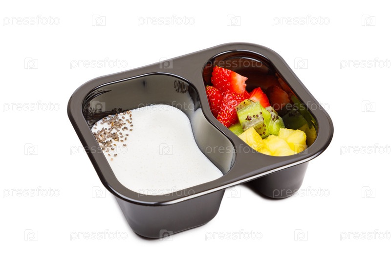 Часть йогуртового десерта с клубникой, киви и ананасом в пластиковой миске