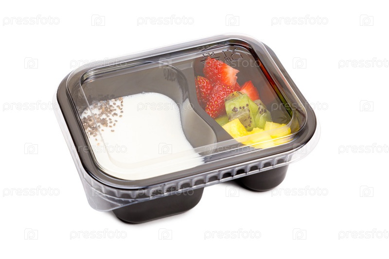 Порция йогуртового десерта с клубникой, киви и ананасом в пластиковой миске с крышкой