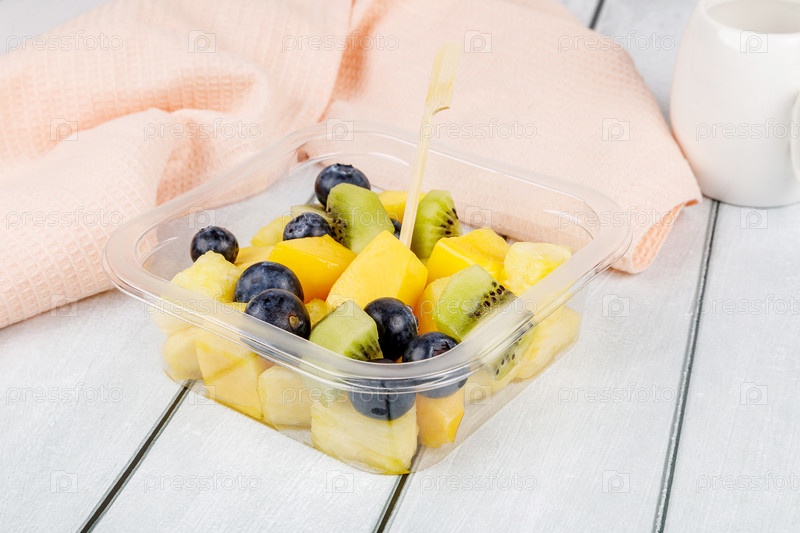 Фруктовый салат из ананаса, манго, киви и черники в пластиковом контейнере на деревянном фоне