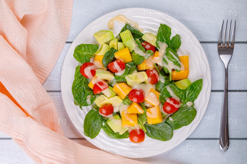 Свежий салат из авокадо, манго, шпината и помидоров черри в белой тарелке на деревянном фоне