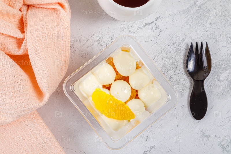 Десерт из сливок, джема и апельсина в пластиковом стакане на бетонном фоне