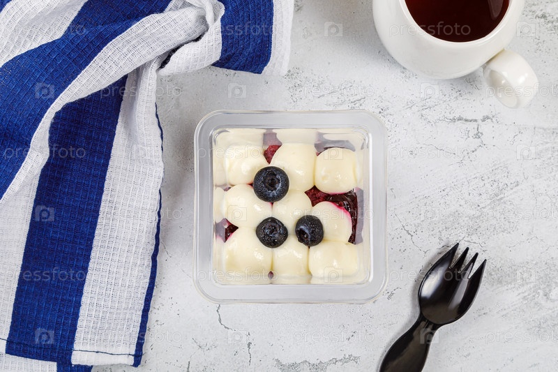 Десерт из сливок, джема и черники в пластиковом стакане на бетонном фоне