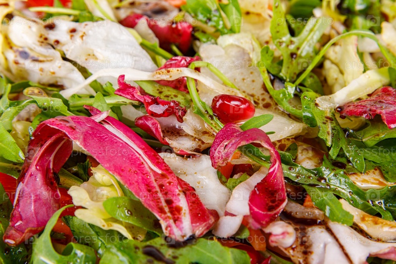 Свежий салат из капусты, зелени, перца, моркови и семян граната, крупным планом