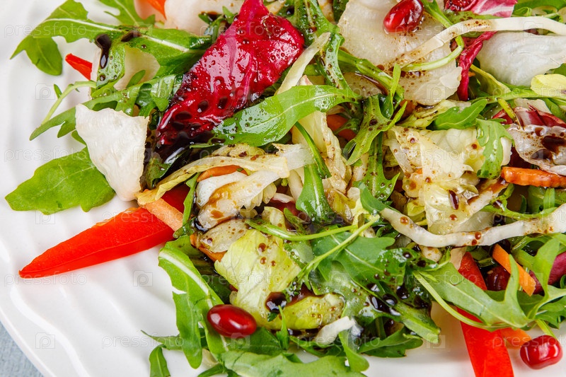 Свежий салат из капусты, трав, перца, моркови и семян граната в белой тарелке. Фото высокого качества